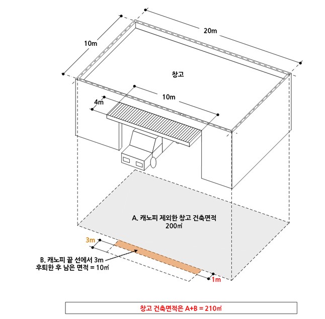 ㉢ 해당 돌출차양을 제외한 창고의 건축면적의 10%를 초과하는 면적