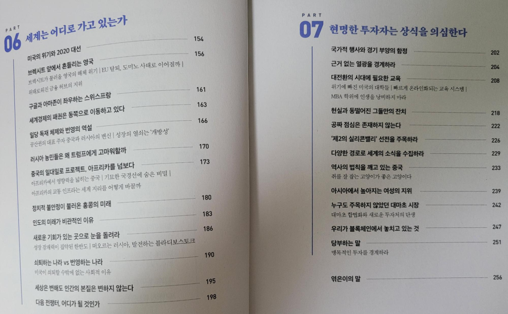 한국에서 짐 로저스가 워낙 유명하기에 별 고민없이 읽었는데 인터뷰를 엮은 책인 것도 읽고 나서 알았다. 어쩐지 좀 가벼운 느낌이더라. 한 번 정도 읽기에는 괜찮다. 목차가 자세히 나와 있으니 그중에서 읽고 싶은 부분만 발췌해서 읽는 것도 시간을 아끼는 방법일 듯.