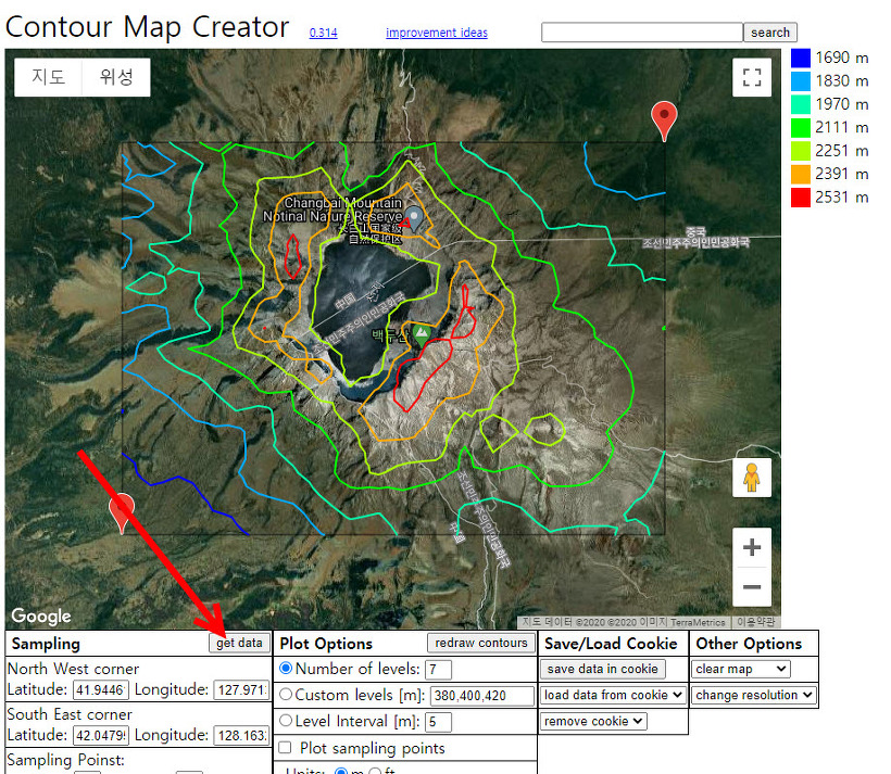 3)하단의 get data를 클릭하면 지형 위에서 등고선을 표시한다.