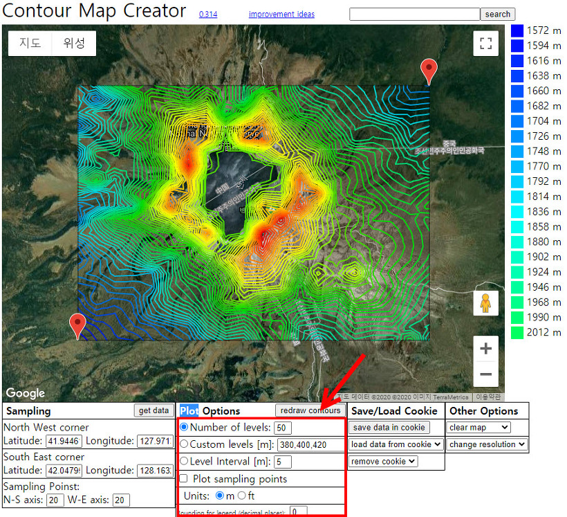 4)하단의 plot options에서 등고선의 옵션을 설정한다. 아래 예에서 number of levels의 수치를 높였다. redraw contours를 클릭하면 이것을 반영한다.