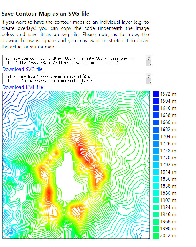 5)페이지의 하단에서 등고선을 저장 및 다운로드할수있다(svg, kml)