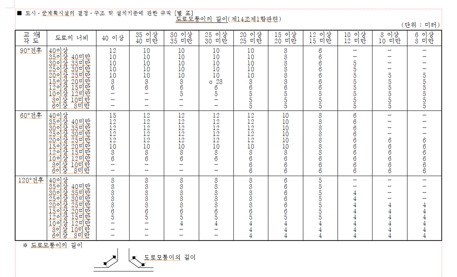 [별표 ] 도로모퉁이의 길이(제14조제1항관련)(도시ㆍ군계획시설의 결정ㆍ구조 및 설치기준에 관한 규칙) (1).hwp