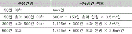 다. 개인공간을 제외한 공유공간(임대형기숙사 내부에서 개인공간을 제외한 다수의 거주자가 공동으로 사용하는 거실ㆍ주방ㆍ공동욕실 등으로서 이동을 위한 복도, 계단, 승강기 및 주차장 등을 제외한다. 이하 같다)의 면적은 수용인원을 고려하여 아래의 면적 이상을 확보하며, 개인공간과 공유공간 면적의 합은 1인당 14제곱미터 이상을 확보할 것(확보해야 하는 개인공간의 면적과 공유공간의 면적은 건축물의 외벽의 내부선을 기준으로 산정한다. 이하 같다)