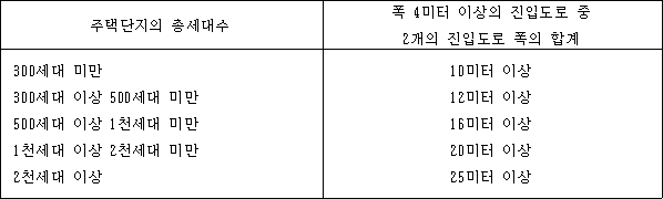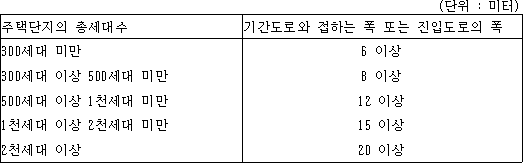 제25조(진입도로) ①공동주택을 건설하는 주택단지는 기간도로와 접하거나 기간도로로부터 당해 단지에 이르는 진입도로가 있어야 한다. 이 경우 기간도로와 접하는 폭 및 진입도로의 폭은 다음 표와 같다.